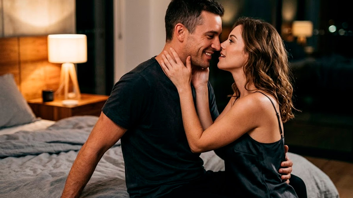 Casal em momento íntimo e sensual no quarto, sugerindo sedução e desejo.